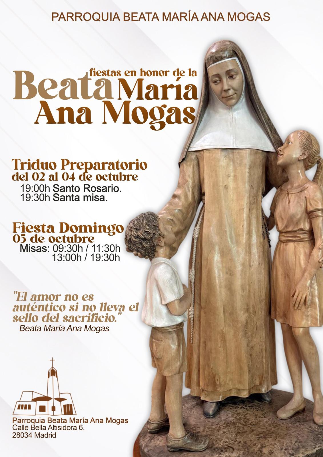 El próximo domingo 5 de octubre celebraremos en todas las misas la fiesta en honor de nuestra patrona la Beata María Ana Mogas. Con anterioridad y durante los días 2 al 4 de octubre tendremos el triduo preparatorio con el Santo Rosario y la Santa Misa. Pidamos a nuestra patrona,…